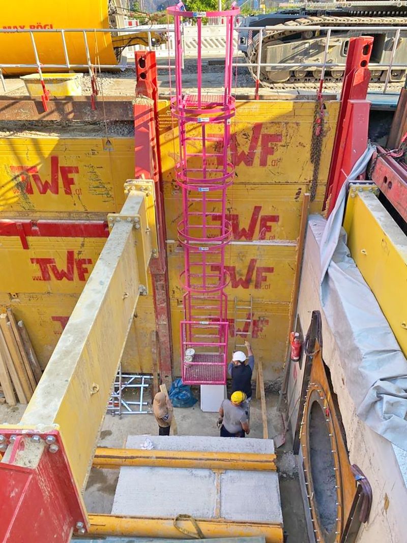 La escalera de entibación se utiliza en todos los sistemas estándar de entibación de zanjas y permite un acceso seguro a profundidades de hasta 10 metros.
